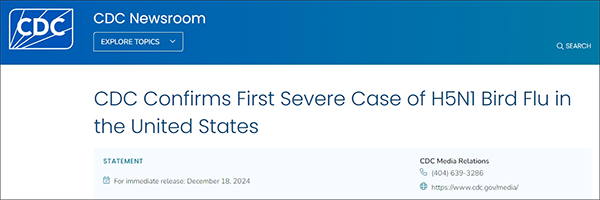 CDC网站当地时间12月18日发布的声明显示,在美国路易斯安那州,一名患者因感染H5N1型禽流感病毒而住院。12月13日,CDC确认了该病例。