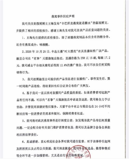 11月20日,针对辛巴所售燕窝被微博博主王海检测为糖水一事,辛选官方微博发表了回应声明。