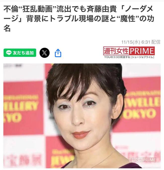 然而,2017年,51岁的齐藤由贵被《FLASH》周刊爆出与一位家庭医生有着长达5年的婚外情。最初她否认两人关系,但随着接吻照曝光,齐藤由贵不得不公开道歉。虽然演艺事业再次受挫,但丈夫选择了原谅,她的家庭并未因此破裂。