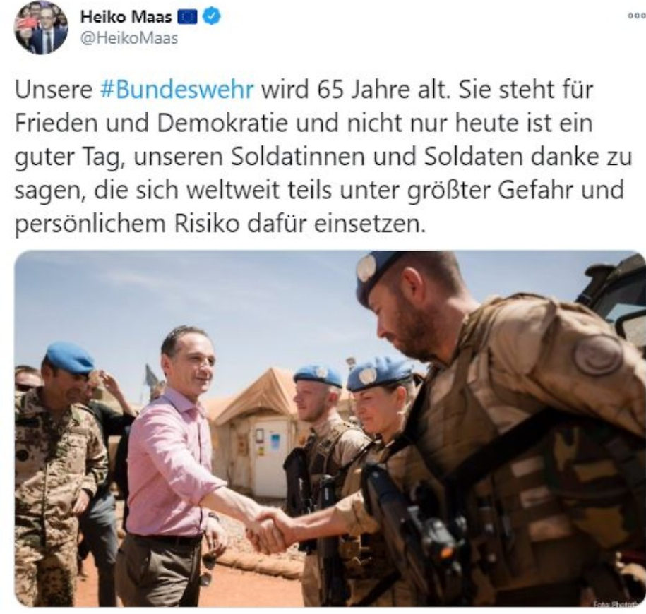 文字写的很好,照片看起来亲切,只有一个问题:和马斯握手的那个军人压根不是德国联邦国防军,而是驻马里的比利时联合国部队。