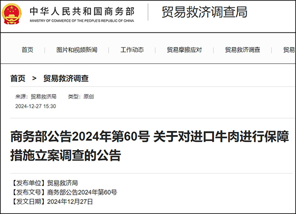 根据上述审查结果,依据《中华人民共和国保障措施条例》第三条的规定,商务部决定自2024年12月27日起对进口牛肉进行保障措施立案调查。现将有关事项公告如下:
