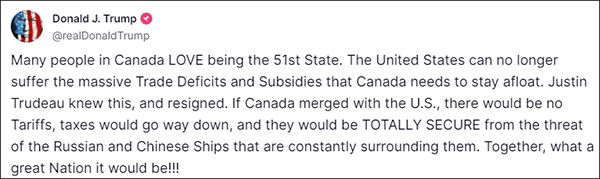 特朗普自夸:“如果加拿大与美国合并,就不会有关税,税收也会大幅下降”。紧接着,特朗普又拿中国说事,声称加方将完全免受俄罗斯和中国船只不断包围的威胁。