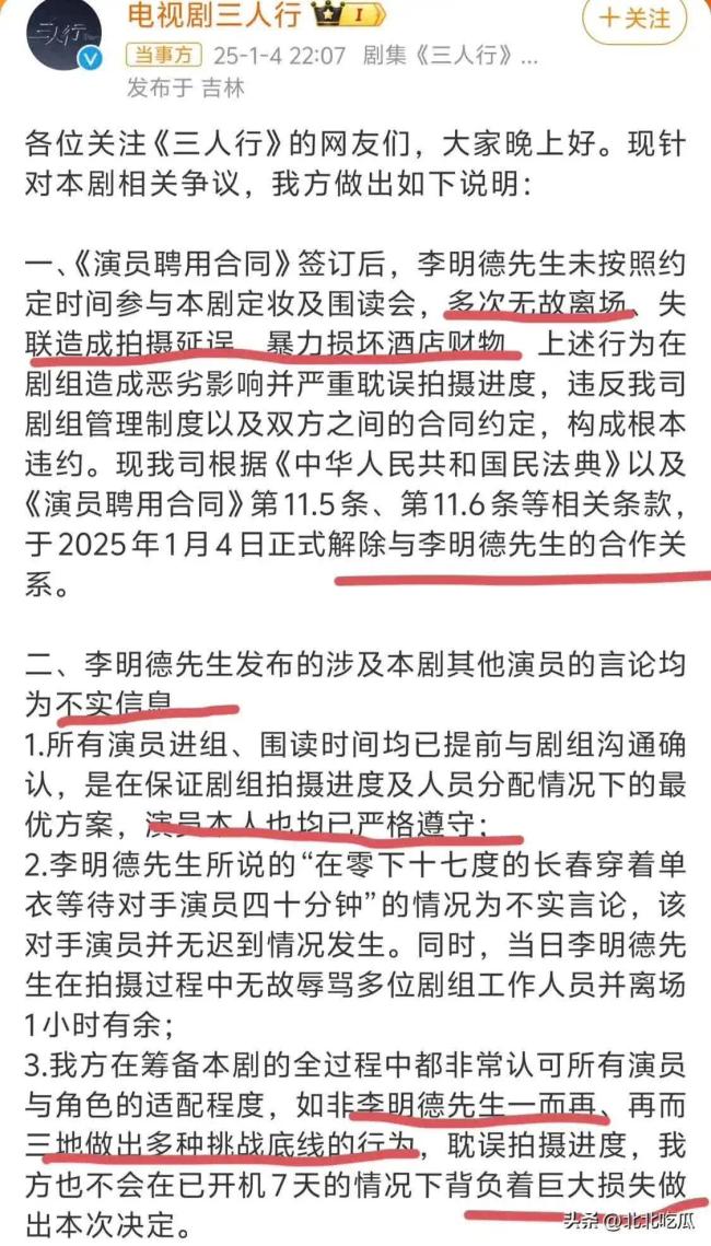22:07:《三人行》剧组正式回应。表示一切都是遵守合约进行,反而是李明德不仅多次迟到,还在现场砸东西。万不得已,才跟他解除合约。