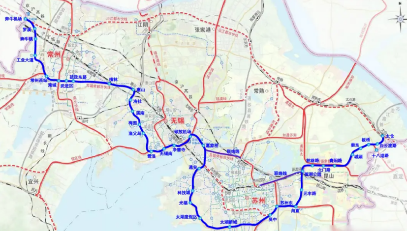 上海连接太仓的,是按《苏锡常城际铁路太仓先导段运营筹备期委托协议》,建设10.3公里太仓先导段,从太仓站出发,与上海嘉闵线北延线衔接,太仓设有太仓站、白云渡路站和十八港路站共三个站点及一个车辆段。