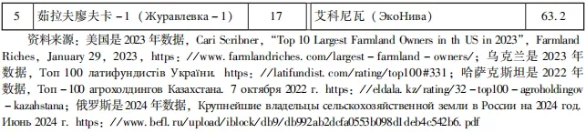 需要说明的是, 澳大利亚大型农场的土地规模能达到100万甚至200万公顷的水平, 但基本都是半荒漠的牧场,与通常意义上以耕地为主的农地不是一个概念。俄罗斯远东萨哈(雅库特)共和国一家驯鹿养殖企业(МУП “Оленекский”)的规模是1330万公顷,也同样是半荒漠的土地,因而没有被BEFL公司列入俄大型农地使用者的行列。中国商业类国有企业北大荒农垦集团有限公司(前身为黑龙江省农垦总局)2024年使用耕地4874万亩(约325万公顷),与俄罗斯农业控股公司农地的私有性质不同。