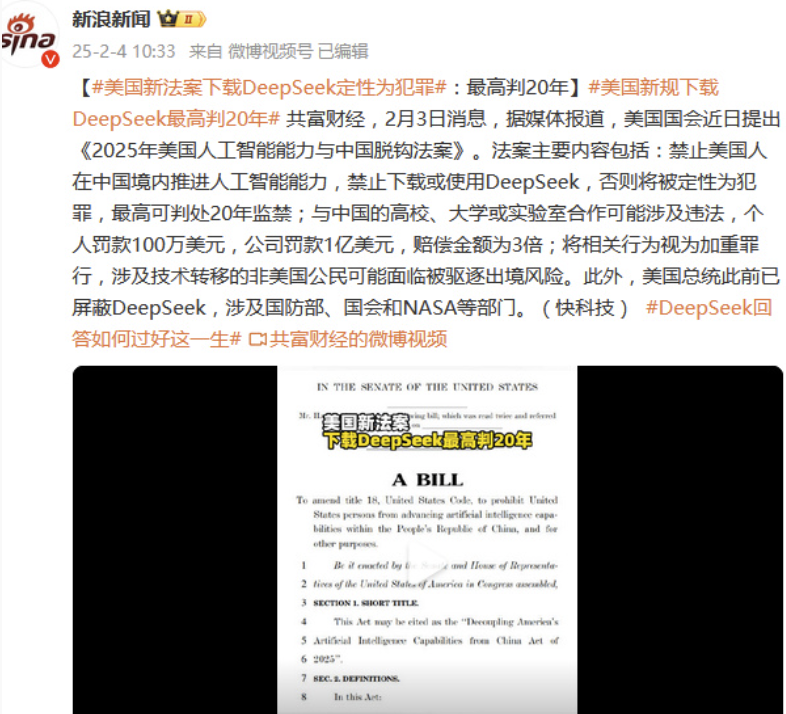 美国所有的国家机构和军队立刻宣布禁用DeepSeek,以威胁美国国家安全的名义。这个尚且可以理解,但随后发生的事情就无法理解了,让人目瞪口呆。2月3日,美国国会提出了《2025年美国人工智能能力与中国脱钩法案》,宣布将禁止美国任何个人和企业下载或使用中国的DeepSeek,如果敢于违反将被定性为刑事犯罪。同时美国的这个法案还禁止美国所有的个人和企业与中国的高校、大学或实验室合作。如果被发现,那么美国的个人将被罚款100万美元,公司将被罚款1亿美元,同时并处和中国单位合作金额的3倍罚款。在美国杀人都判不了那么久啊亲(杀太多可以突破20年),结果用中国的软件犯下的罪行比杀人还严重?至于理由,居然又是所谓的威胁美国国家安全,现在对这个词都麻木了,感觉美国的国家安全太脆弱了,啥啥多能威胁到,连个人下载使用一个软件都能威胁美国。这件事有多荒谬,把这个新闻里的中美互换身份你就能感觉到了。假设中国打算立法,宣布任何下载和使用美国ChatGpt人工智能软件的中国人属于刑事犯罪,将被判处最高20年有期徒刑,任何和美国高校、大学或实验室进行合作的中国个人或企业将被罚款100万至1亿,同时并处合同金额3倍的罚款。当这些描述白纸黑字的搬上新闻给你看的时候,你作为中国人是一种什么样的感受?换位思考之后,你就知道这件事有多荒谬了,已经不仅仅是砸碎美国灯塔的问题了,而是美国已经开始变成了黑暗深渊。私自用他国软件被判刑最高20年啊,哪个国家提出过这么荒谬的法案?想都不敢想。美国这次过于激动了,显然是破防破到精神失常,否则这么没脑子的法案绝对不应该出现在国会上,把美国的脸都给丢完了。说这事是丢美国的脸,不仅仅是其宣布的处罚力度过于荒谬,而且在于这个法案根本达不到立法者想要的效果,所以结果就是纯粹的丢脸。首先美国以如此恐怖的处罚力度来打压DeepSeek,不是因为所谓美国个人信息的问题,因为抖音海外版TT拥有的美国用户数量比DeepSeek多的多的多,美国也只是想吞并股权而已,可没有说打算宣布美国人使用TT算刑事犯罪。对DeepSeek如此特殊对待,是因为DeepSeek动摇了美国目前的唯一指望,也就是人工智能概念。在中美竞争里美国已经全部弱势,缠斗8年后完全看不到通过正常手段战胜中国的希望,还残留的科技领先项目已经不多了,而在这些项目里大多数即便领先也撼动不了中美竞争的大局。唯有人工智能,被誉为有可能创造未来改变未来,是美国所有领先于中国的科技项目里,唯一能让人感到有希望能借此重新压制中国的。所以美国对于人工智能的期望特别大,整个美国股市都在单吊AI概念,把造AI算力芯片的英伟达给硬生生的买成了美国及全球第一大市值公司。但DeepSeek出现后,硬生生的破灭了美国在人工智能方面的优势,硬生生的戳破了人工智能必须购买大量算力芯片的虚假泡沫,给美国来了个前后夹击。所以美国怒了,出离的愤怒,誓要弄死DeepSeek。但中国研发DeepSeek的是一家金融公司,幻方量化,是靠炒股赚钱的,根本就没打算靠DeepSeek赚钱,这玩意对其母公司而言甚至只是个副业,这种不图钱的特殊性让DeepSeek直接无敌了。商业公司大多是不开源的,即便开源也是为了特殊目的,但DeepSeek是为了开源而开源,人家压根就没想过商业化赚钱的事情,利用这个在美国开空单,一把都能赚OpenAi苦哈哈的收十几年会员费还要多的钱。因为DeepSeek的母公司没想过靠这个商业化赚钱,所以无脑开源,所以不需要在美国收广告费,甚至不需要在全球任何一个地方收任何钱,所以美国压根管不住,一点抓手都没有。别说美国的这个立法落实非常困难,就算真的落实了,就算能让美国人真的不用DeepSeek,那对DeepSeek的母公司来说也无所谓。既不会影响DeepSeek的进化速度,也不会减少DeepSeek一毛钱营收,因为营收本来就是零。然后DeepSeek直接开源了,全球开源,代码免费送全球,不仅欧日韩印等原本AI远远落后的国家迅速跟上,甚至非洲等国家都迅速跟上了,大家都瞬间追上了美国,拥有了和美国差不多的人工智能实力。美国斯坦福大学和华盛顿大学的团队使用DeepSeek的代码,最低仅花费了50美元就成功复现出了堪比OpenAI-O1版本级别的人工智能。这么低廉的成本外加开源,是任何人都挡不住的,美国的实力再强一百倍也不行。美国单位自己用那还不是个事,关键是全球所有国家的机构都在用,这些机构瞬间追平美国最先进能力后,完全可能有人灵光一闪再取得突破。不管是谁取得了下一个突破,反正只要不是美国突破就行。中国可以靠很多手段回血,可以靠很多手段慢慢超越美国,但美国如果失去了通过人工智能收割全球财富的能力后,那可就一点办法都没了。至于直接把算力需求爆减95%,戳破了AI算力泡沫,这个更是阳谋,一点办法都没有,就算DeepSeek明天就原地消失美国也没办法恢复原来的算力泡沫。就连造算力芯片的英伟达自己,都连夜改用DeepSeek的代码了,没办法,成本低就是王道,谁不用谁死。最近几天美国的人工智能OpneAI的最新O3版本出现了重大问题,欧美的用户在用英文提问OpneAI的时候,给出的结果是英文的,但其给出的思考过程居然是中文的,这让全世界都震惊了。欧美老百姓对此深深的困惑,为什么O3-mini会用中文思考问题。。。OpneAI最新发布的O3版本,是日常读写均使用英文的人员制作出来的,其服务器放在纯英文国家,用户