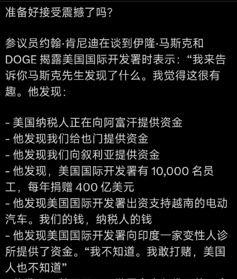 美国很多人震惊于“国际开发署”的项目之离谱,他们甚至还发现,美国的钱不只是流向乌克兰、以色列这些美国的“盟友”,甚至有大量的资金流向阿富汗、叙利亚、也门这些美国的“敌人”……合着美国“国际开发署”的远程养殖,还是两头养?