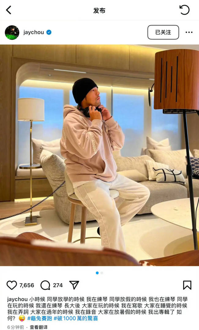 2月8日,周杰伦在社交平台上更新动态,他发文称:“小时候,同学放学的时候,我在练琴,同学放假的时候,我也在练琴,同学在玩的时候,我还在练琴;长大后,大家在玩的时候,我在写歌,大家在睡觉的时候,我在弄词,大家在过年的时候,我在录音,大家在放暑假的时候,我出专辑了,如何?”