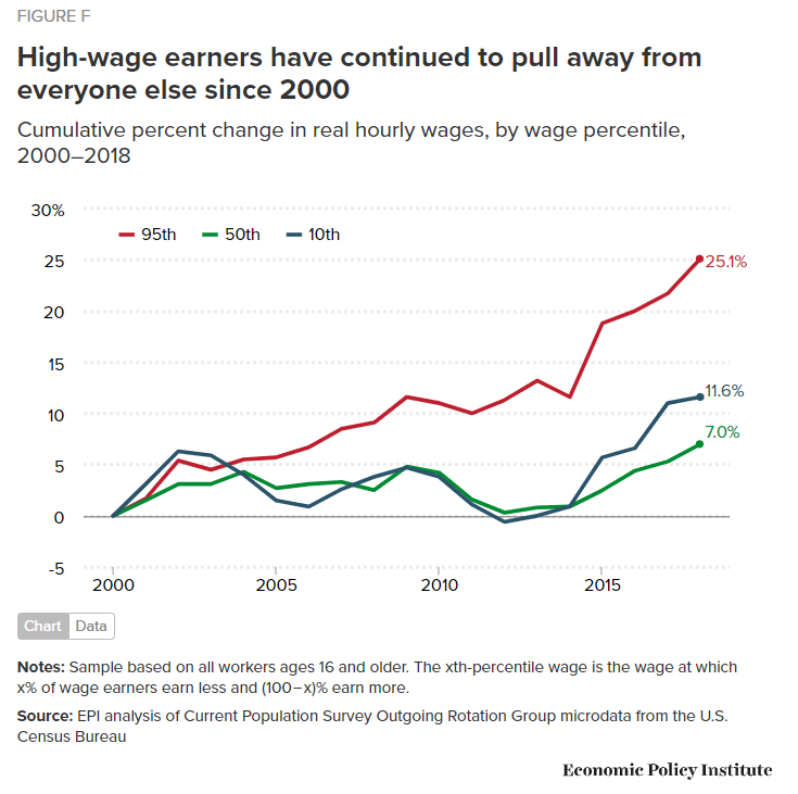 上图:这个图数字比较新,可以看到2000~2018年的变化,将头部的5%及底部的50%及10%进行比较。可以看见,本世纪以来,美国的贫富差距在加速放大。