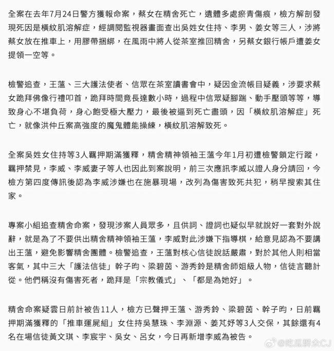 据悉,警方查获一段秘密录音,揭露李威在案件中不仅担任军师角色,还涉嫌教唆信徒对蔡女施暴,并指导信徒如何统一口径隐瞒案情。录音中显示,李威教唆信徒在检警侦讯时要说“忘了、不记得”,避免透露王薀的涉案情况。检警24日在李威住处搜出相关证据,并将其与妻子一同改列为被告,全案目前已有13人被列为被告,其中7人已被羁押禁见。