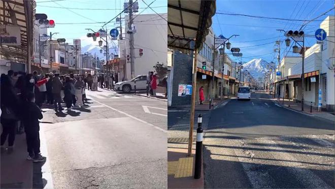 只见大批亚洲脸庞的游客挤在日本富士山脚著名打卡拍照景点「本町二丁目」,游客为了拍美照,不顾危险站在马路上疯狂拍照,由于大批人潮拥挤在路口导致交通堵塞,人和车都很难通行。