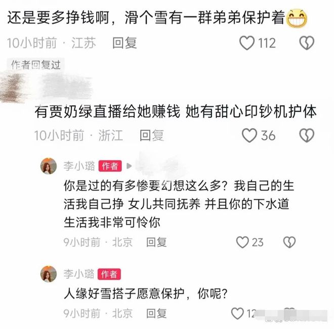 看到女儿承受了这么多压力,李小璐也很心疼,在社交平台上鼓励女儿。网友说甜馨遭受的谩骂都是因为李小璐这个母亲导致的,李小璐也丝毫不受道德绑架,回答“是你造成的。”