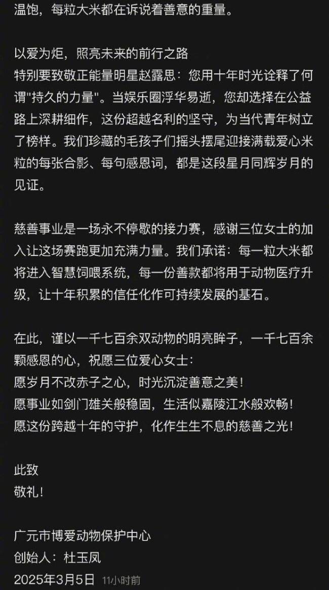 3月5日,广元博爱动物保护中心在社交平台上发文感谢赵露思,称她自2015年起持续向广元流浪动物救助中心捐款,至今已坚持十年。