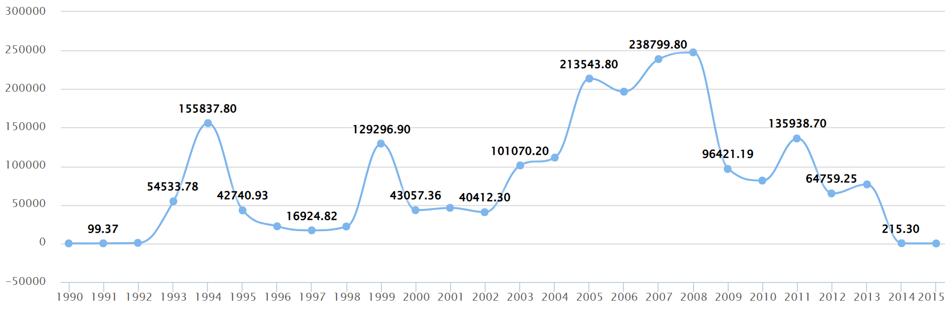 1990-2015年美国对俄援助情况。数据来源:复旦大学国际关系研究数据库。