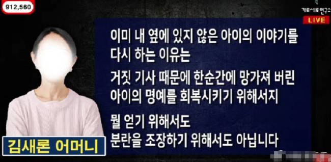 3月11日,韩国娱乐博主今日在直播中持续爆料,他放出了一段立场文,并自称这是金赛纶母亲所写的,文中表示:“我不是为了得到什么,也不想什么挑起争端,只是希望被记住和纪念,就像生前作为演员那样,不论为别人的笑柄,请帮我恢复赛纶生前的名誉。”