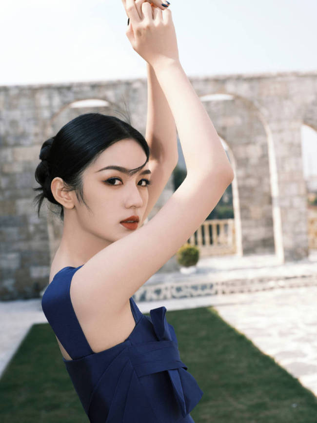 周也蓝色单肩礼裙锁骨曼妙 低盘发造型优雅似公主