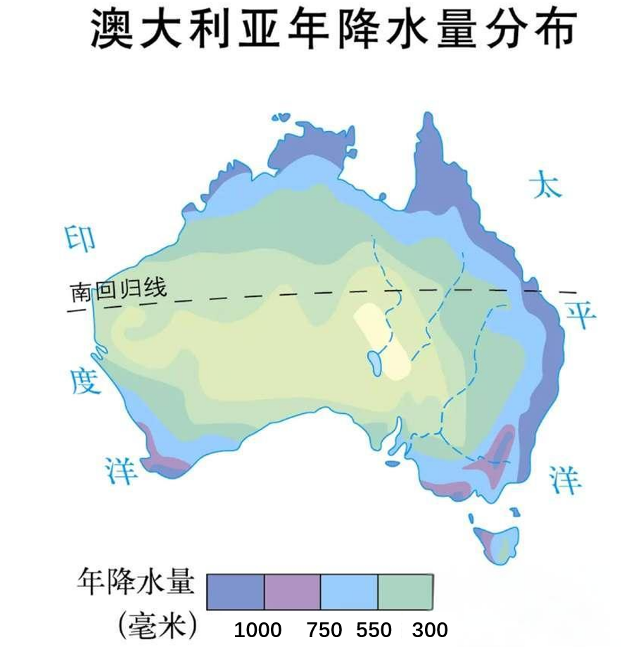这就导致澳大利亚水分蒸发量巨大,500mm年降水量在我国可以满足农业种植了,在澳大利亚则勉强不沦为沙漠。