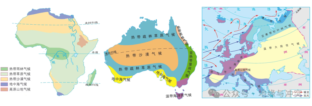 气候类型分布图上,澳大利亚有的气候类型,在世界其他地方都能找到,比如热带草原气候,整个非洲大陆和印度多的是,地中海气候和温带海洋性气候在欧洲更是典型。