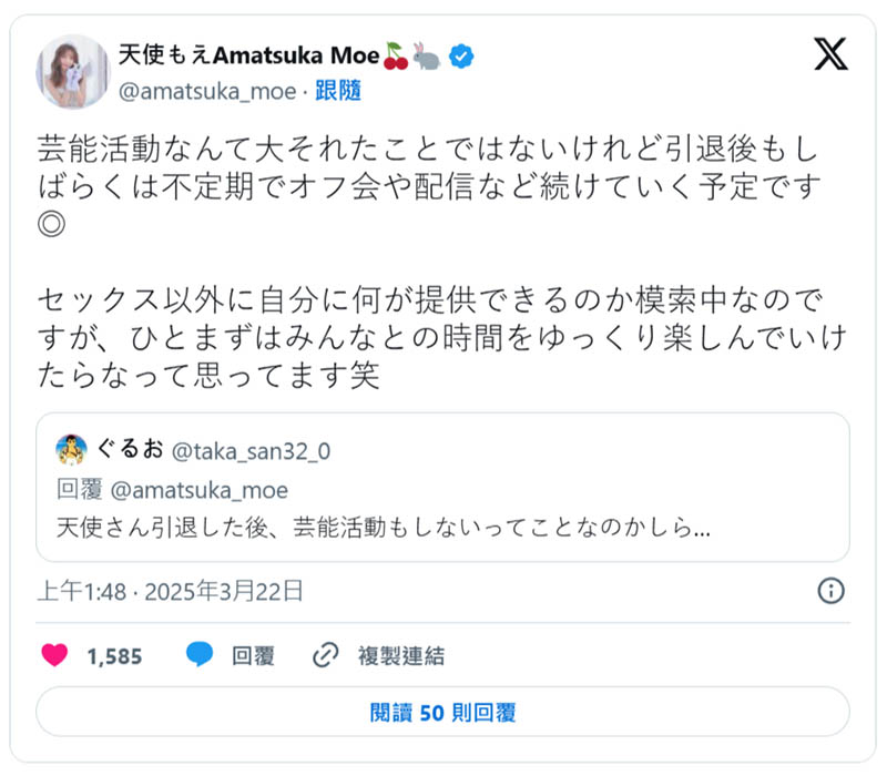 至于不做女演员后要干嘛呢?天使もえ(天使萌)说自己打算不定期的举办粉丝见面会然后也会直播,虽然还不清楚能做什么,不过她很珍惜与粉丝互动的机会,引退后也没打算放弃: