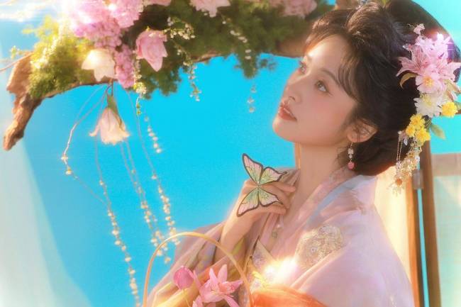 沈月一组古风写真释出,穿粉色古装簪花古韵天成,春天气息浓郁。