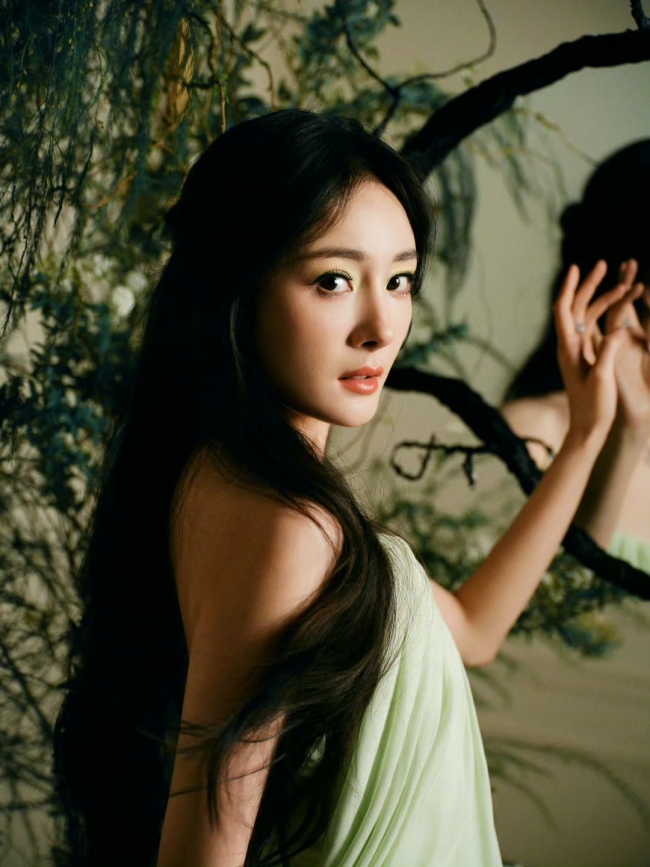 杨幂身着嫩绿开衩裙秒变森林女神 大方秀白皙美腿