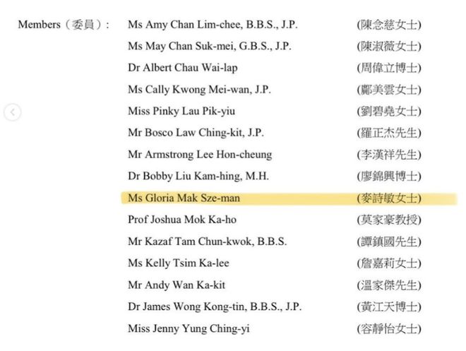 而她的名字亦写在了廉政公署小区关系市民咨询委员会非官方成员名单上。
