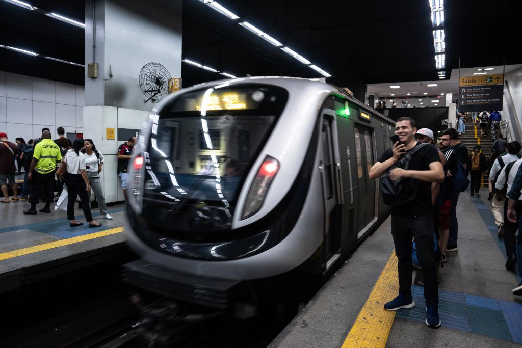 2024年11月13日,在巴西里约热内卢博塔弗戈地铁站,一辆由中车长春轨道客车股份有限公司制造的地铁列车驶入站台。新华社