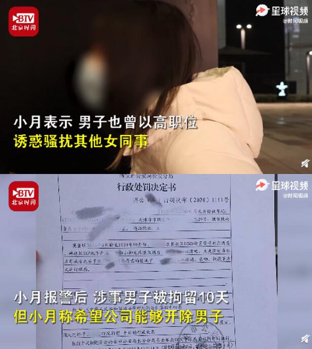 12月9日,陕西西安。小月称自己今年3月入职一家公职教育类培训机构后,半年内被上司多次性骚扰。小月介绍,和当事男子认识约七八天后被其强摸大腿和亲吻。此外,该男子也曾以高职位诱惑骚扰其他女同事。小月报警后,涉事男子被拘留10天。但小月称,自己觉得公司也应该摆明态度开除他。