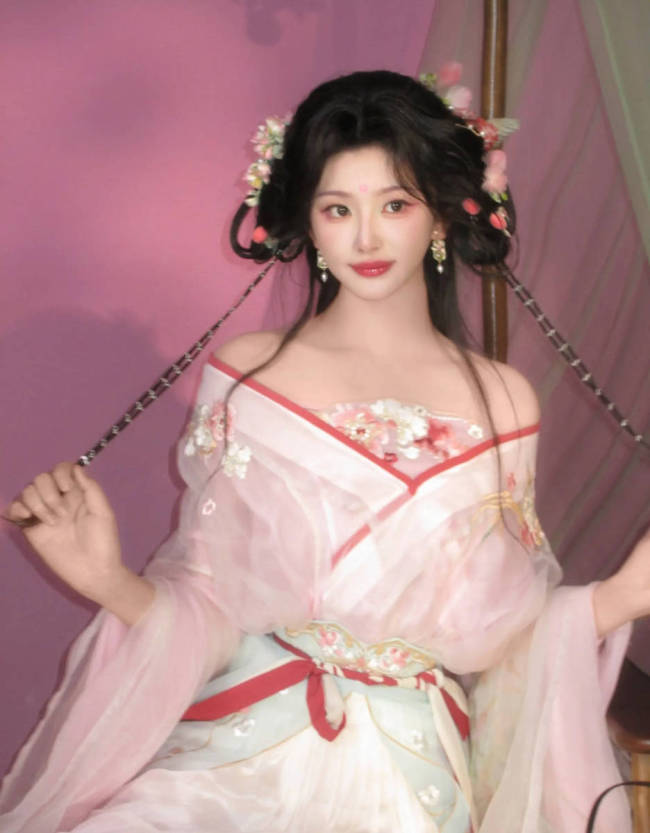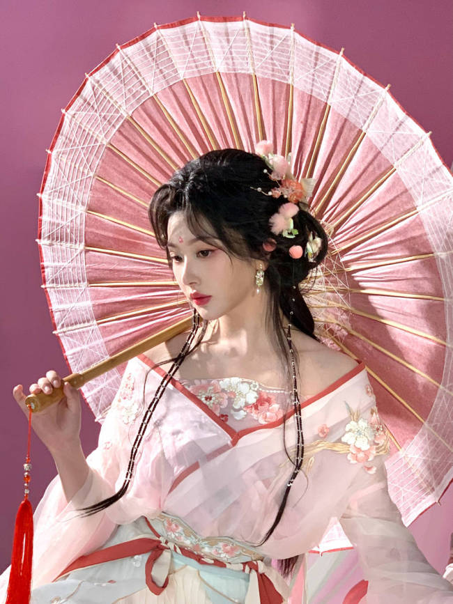 孔雪儿一组综艺新造型释出,照片中她穿粉色抹胸古风裙秀完美直角肩,手拿油纸伞优雅灵动,粉粉嫩嫩简直是人间水蜜桃。