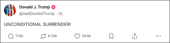 之后,特朗普又单发了一条全是大写字母的“无条件投降(UNCONDITIONAL SURRENDER)!”