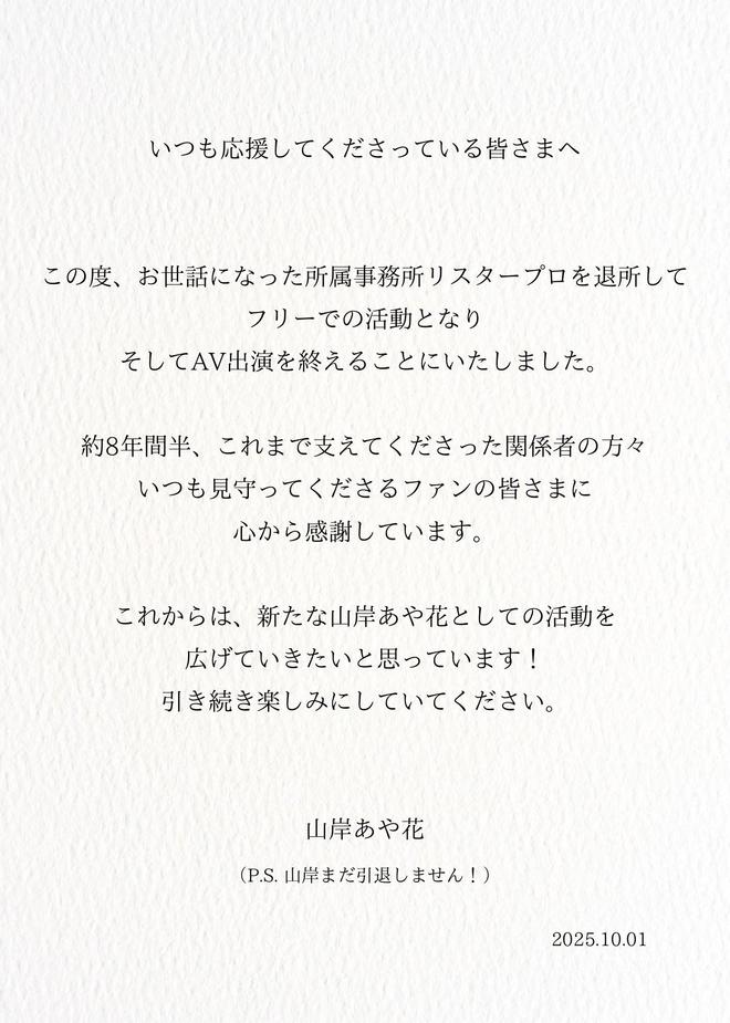 在参加完澳门的活动后,山岸あや花(山岸绮花)终于在自己的社群上发文:她说自己已经退出了事务所リスタープロ(ListarPro),也结束了拍摄的工作,未来将以自由女优的形式活动,这些年来合作的相关业者以及支持自己的粉丝,她衷心感谢,敬请期待全新的山岸あや花(山岸绮花)和大家见面: