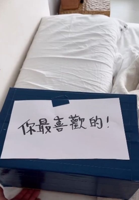 叶蒨文在社交网分享了一段视频,视频中房间门外贴着一张纸条,上面写着 “GM:给你准备的生日礼物放在床上了!” 画面中,GM 的手推开了一扇门,房间大床上放着一个礼物盒,盒子上写着 “你最喜欢的!”。