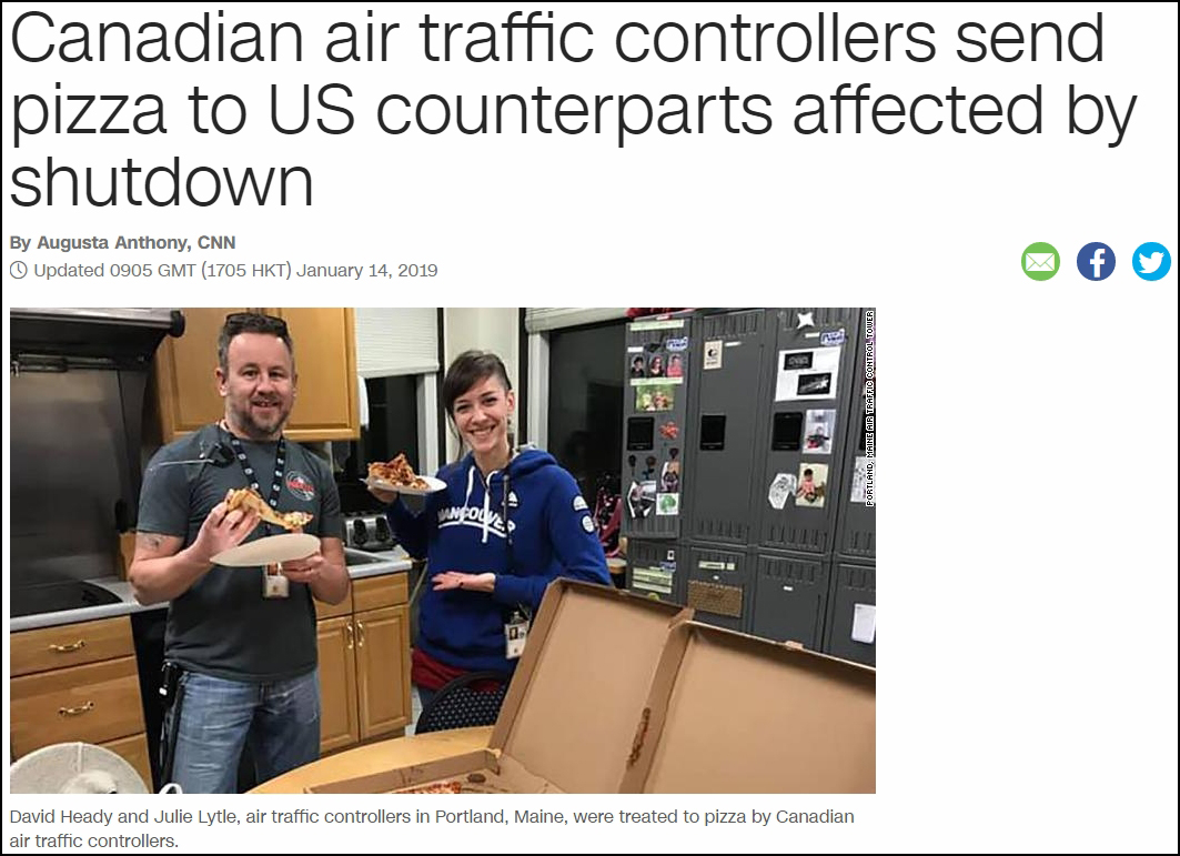 2019年,加拿大空管员给受政府关门影响的美国同行送披萨。