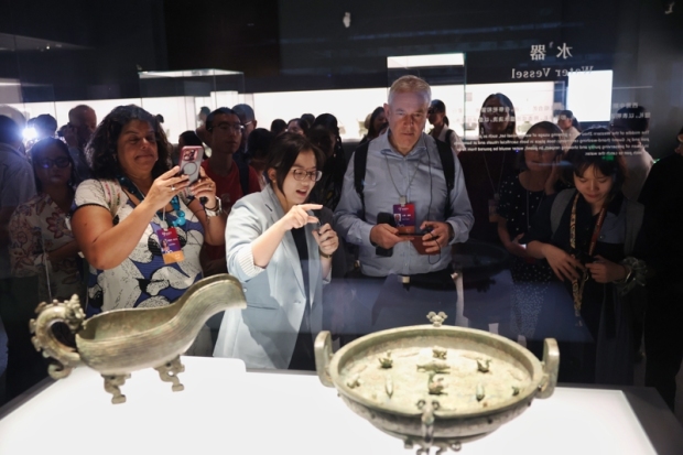第二届世界中国学大会中外嘉宾在上海博物馆东馆欣赏青铜文物。