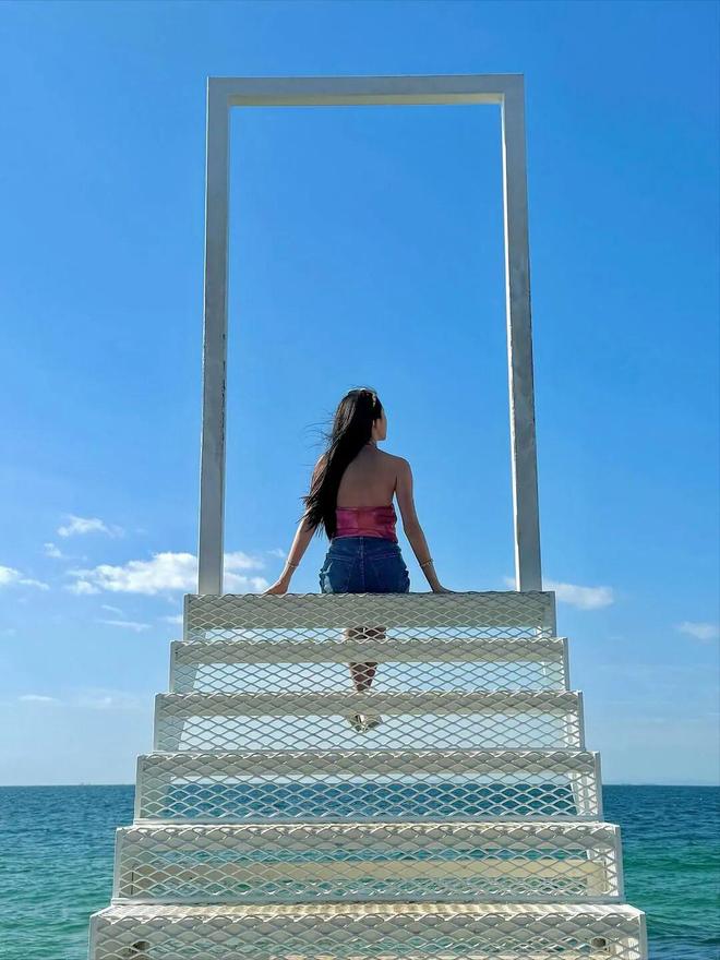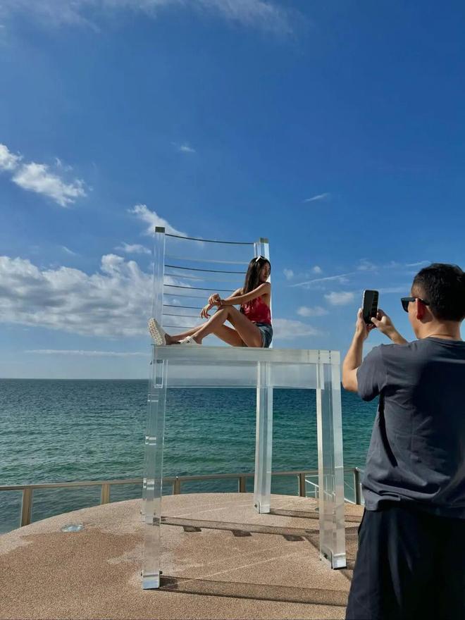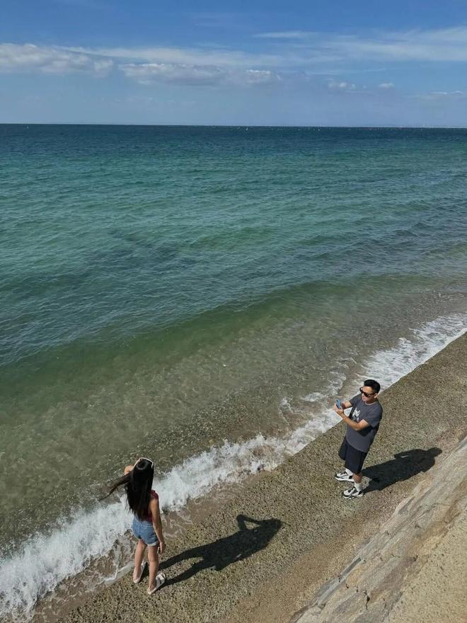 照片中,林文龙与郭可盈在蓝天白云和无敌海景的背景下,合体摆出爱心姿势秀恩爱。