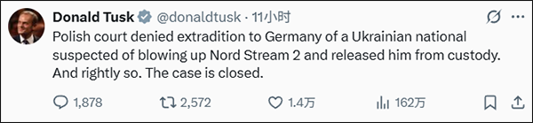 波兰总理图斯克随后在X平台上表示,这一裁决“合理”,并对法院的决定表示支持。他称,“波兰法院已拒绝将涉嫌破坏‘北溪-2’管道的乌克兰籍嫌疑人引渡至德国,并已将其释放。这样做是正确的,此事已了结。”