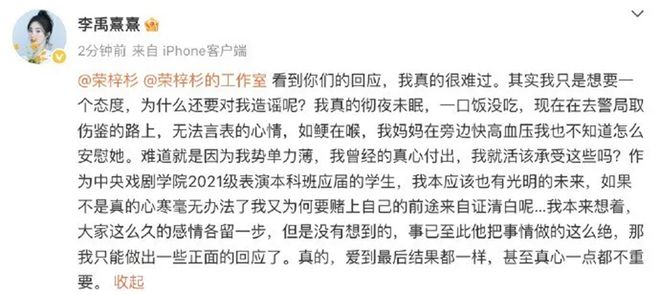 这给后来荣梓杉澄清留了后手。事情发酵之后,荣梓杉工作室回应,将污水都泼给了李禹熹,骂李禹熹造谣,李禹熹就是个单方面暗恋荣梓杉的私生,一直跟踪尾随,荣梓杉不堪其扰,所谓恋爱也只不过是她幻想出来的而已。
