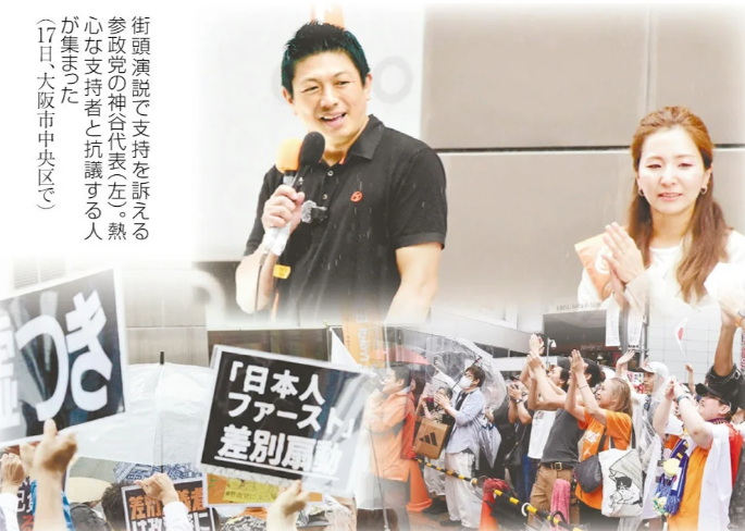 7月20日,日本参议院选举,参政党一举拿下14席。图中为参政党党首神谷宗币在街头演说,现场有支持者和抗议者。读卖新闻