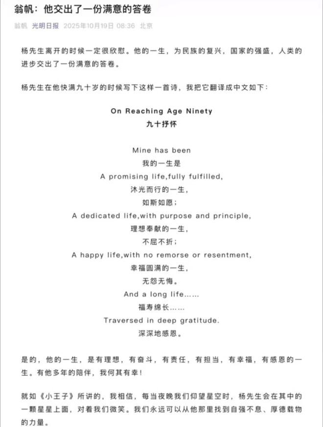 有工作的时候,两人各忙各的,在各自的领域发光发热,闲下来的时候,他们就到处游玩,领略大自然的美景,享受生活的恬静与幸福。他们的生活自在轻松,充满了温馨与爱意。杨振宁最后在医院的这段时光,也是翁帆一直贴身照顾他。他们两个这二十多年的婚姻生活比我们想象的甜蜜多了,爱情从来不是只有一个表现形式,老夫少妻也不单纯是因为贪财好色,世上还是有真爱的。这从翁帆的最后的纪念信就能看出来,字里行间都是对杨振宁的感谢,这段婚姻是她一生的幸运。