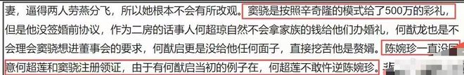 这可把何超莲急坏了,无奈之下,她只好去求自己的亲妈三太陈婉珍。陈婉珍实在拗不过女儿,掏钱给小两口办了婚礼。但这个爆料版本里还说,窦骁只掏了500万的彩礼,也正是因为这个缘故,三太不同意窦骁和何超莲领证。按照这个说法,窦骁一门心思想当赘婿,还不老实想要掠夺何家的家产,而何超莲只是个单纯的傻白甜恋爱脑,被窦骁耍得团团转。
