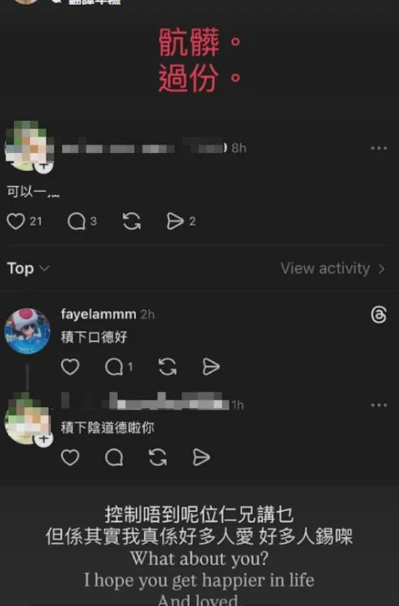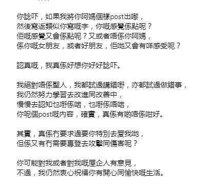 林盛斌接着表示:“你想想,如果我把你妈妈的照片发出来,然后写和你类似的话,你会是什么感受?你妈妈又会是什么感受?或者不是你妈妈,是你的女朋友,或者好朋友,他们又会有什么感受呢?说真的,我真的希望你好好想想。我绝对不是圣人,我也试过说错话,也试过做错事,我还在努力学习改进和完善自己,慢慢去明白什么是对、什么是错。你这条帖子的内容,确实,真的有点不太好。”