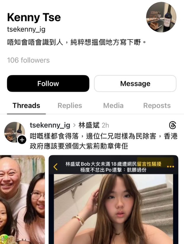 “金牌司仪”林盛斌(阿Bob)17岁的大女儿林霏儿(Faye),近日在社交网公开透露遭受网友性骚扰,有网友针对她的外形进行批评,留言称:“长成这样也能下得去手,哪位仁兄这么‘为民除害’,香港政府应该给颁个大紫荆勋章给他。”