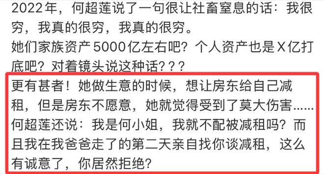这么一通下来,何超莲受害人的人设算是立住了,但事情真的有这么简单吗?别忘了,何超莲自小在何家长大,何家人最会做生意了,何超莲年纪轻轻,账可是算得一点都不糊涂。有爆料说,她做生意租房子的时候,都会特意跟房东讲价。有一次房东拒绝了她的讲价要求,她竟然专门在镜头前蛐蛐房东。她还说自己在爸爸去世的第二天,特意找房东沟通,强调自己是何家的女儿。言下之意,何小姐愿意住你们的房子就感恩戴德吧,怎么还好意思收钱。这言语间,一副高高在上、傲慢的样子,对钱看得那叫一个重。