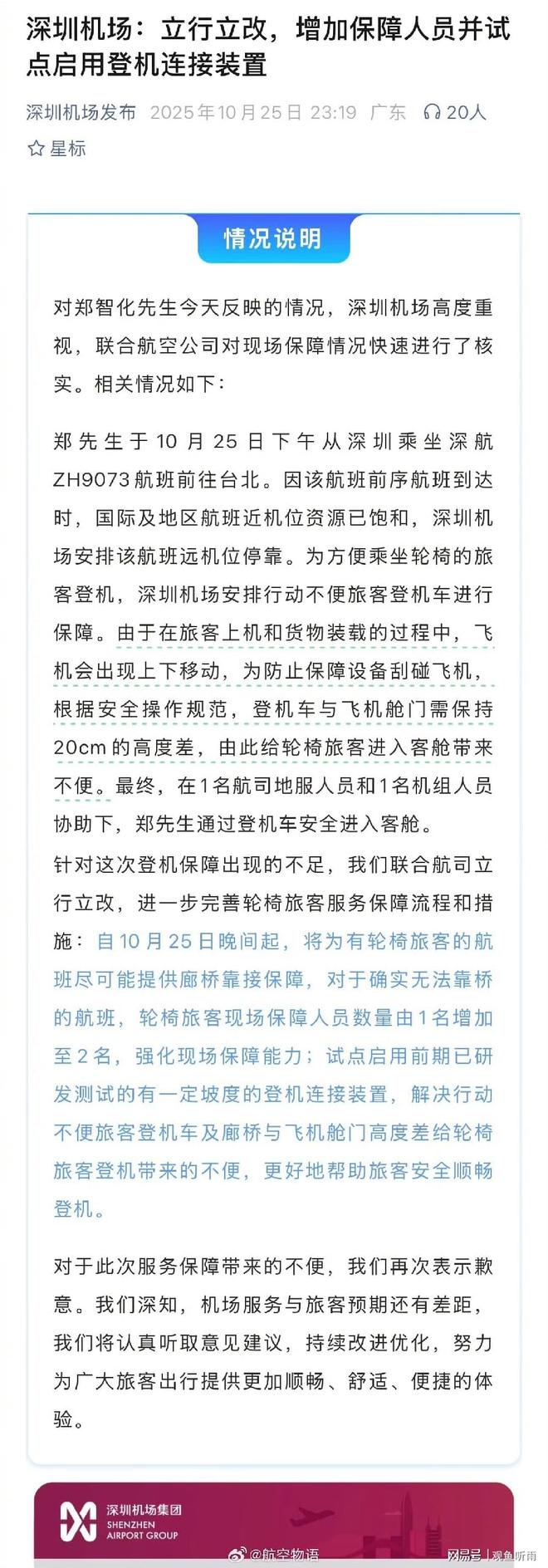 可事情很快就有了反转,当天晚上深圳机场就回应了,说因为航班前序到达时近机位满了才安排远机位,用登机车保障是为了方便轮椅旅客,而且按安全规范,登机车和舱门得保持20厘米高度差,避免刮碰飞机。