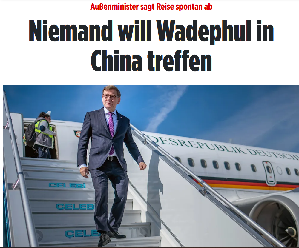 他批评德国现任外长在对华关系上“找不到调,踩不到点”(findet nicht den richtigen Ton),与布伦塔诺、勃兰特和根舍这些备受世界尊敬的德国外长相比,完全不在一个档次上。他写道:正因如此,当瓦德富尔这次出访中国时,本国最重要的企业领袖选择留在国内,而北京最有影响力的政治人物也都“另有要事”。