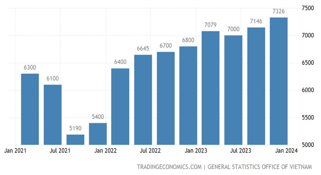 越南月平均工资的柱状图(纵轴单位:千越南盾/月)。目前,越南的月平均工资约为7326000越南盾,约合300美元。图源:《中资企业在越南发展报告( 2023-2024 ) 》