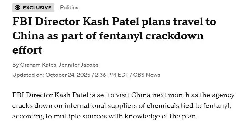 举几个例子。CBS在24号的时候有个独家新闻,说的是FBI的局长Kash Patel下个月可能要访华。他来能干什么?大概率就是谈芬太尼合作的事儿。所以昨天特朗普那边说芬太尼关税先降10%,换的是什么?换的应该是Kash Patel一个确定的访华的机会。后续的10%很可能是要等两边谈出点什么来再处理。这就是时间差。