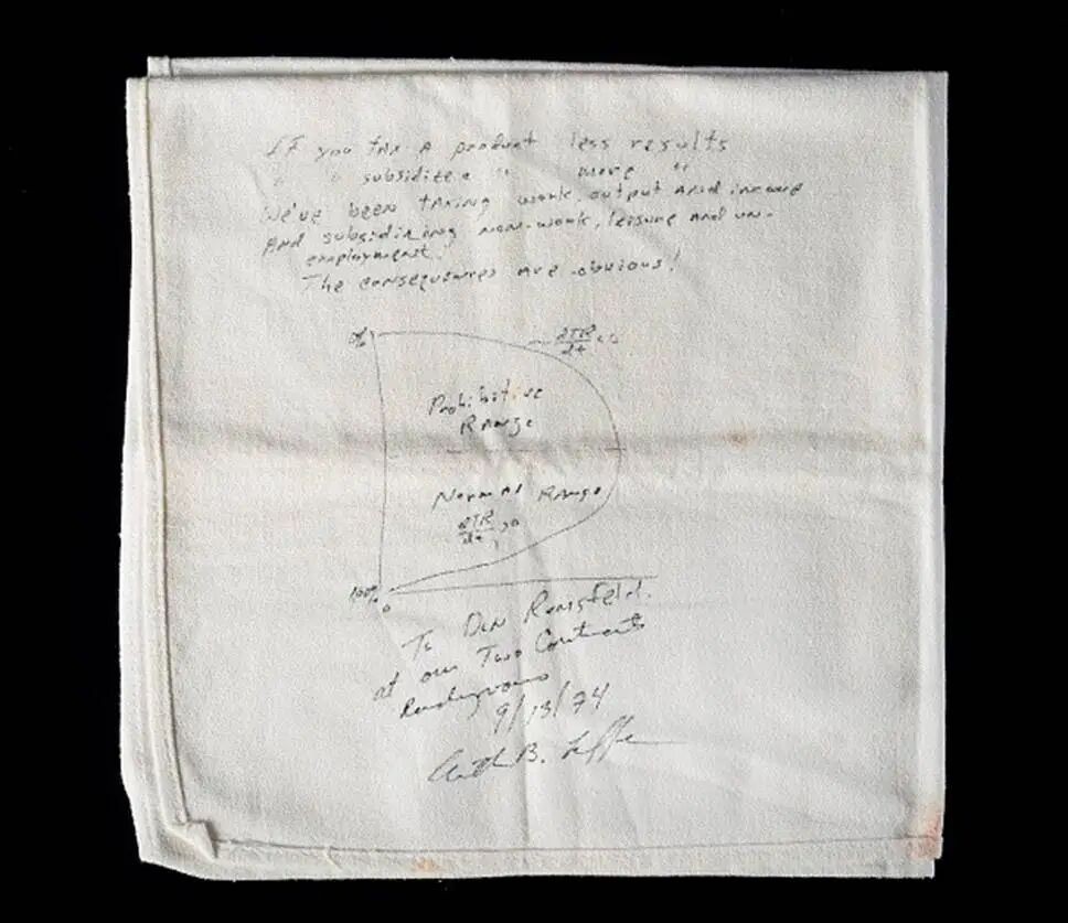 餐巾上的曲线,就是著名的“拉弗曲线”(Laffer Curve)。(顺带一提,这张餐巾现在保存在美国国家历史博物馆。而且神奇的是,“拉弗曲线”的故事直到今天都没有统一,几个在场的人都有不同的说法,拉弗本人都记不清楚状况了,有的人说这个拉弗曲线应该是画在一张纸上而不是布上,有的人说这场会面进行了不止一次,有的人说拉姆斯菲尔德其实不在场……)