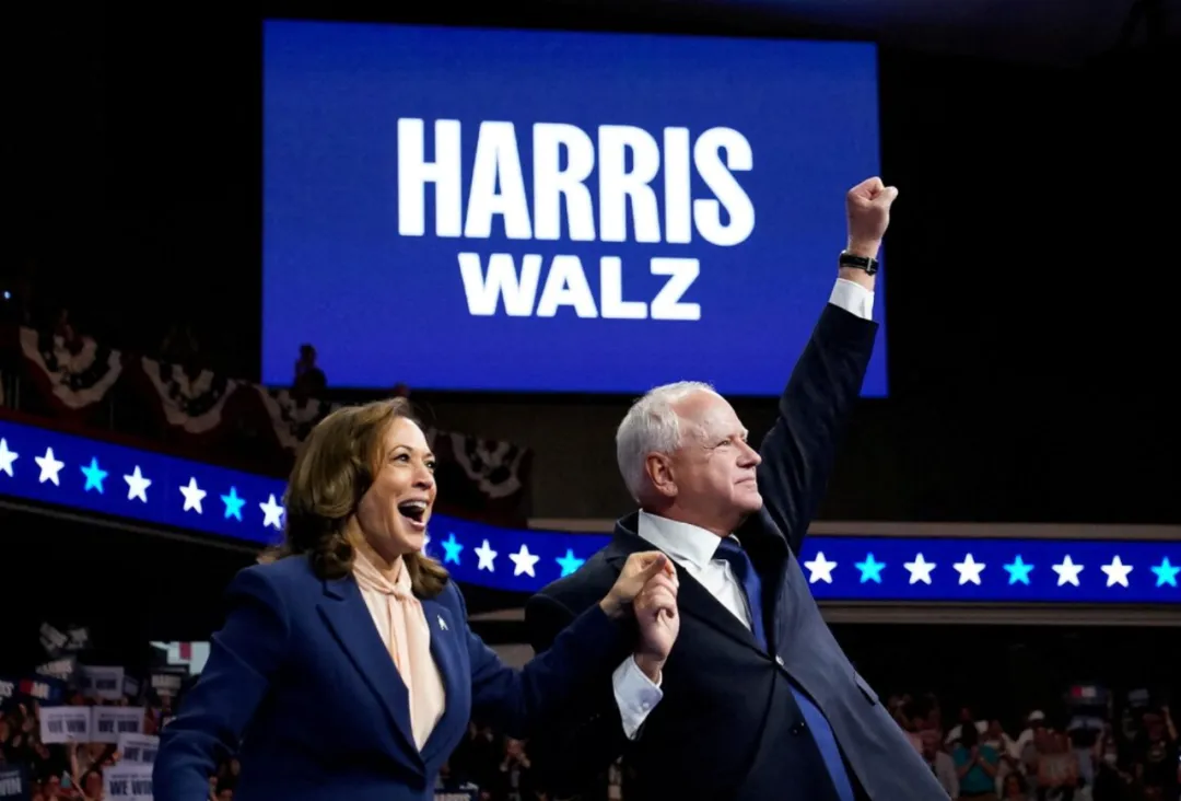 2024年8月6日,卡玛拉·哈里斯和她新选定的副总统竞选搭档、明尼苏达州州长提姆·沃尔兹。