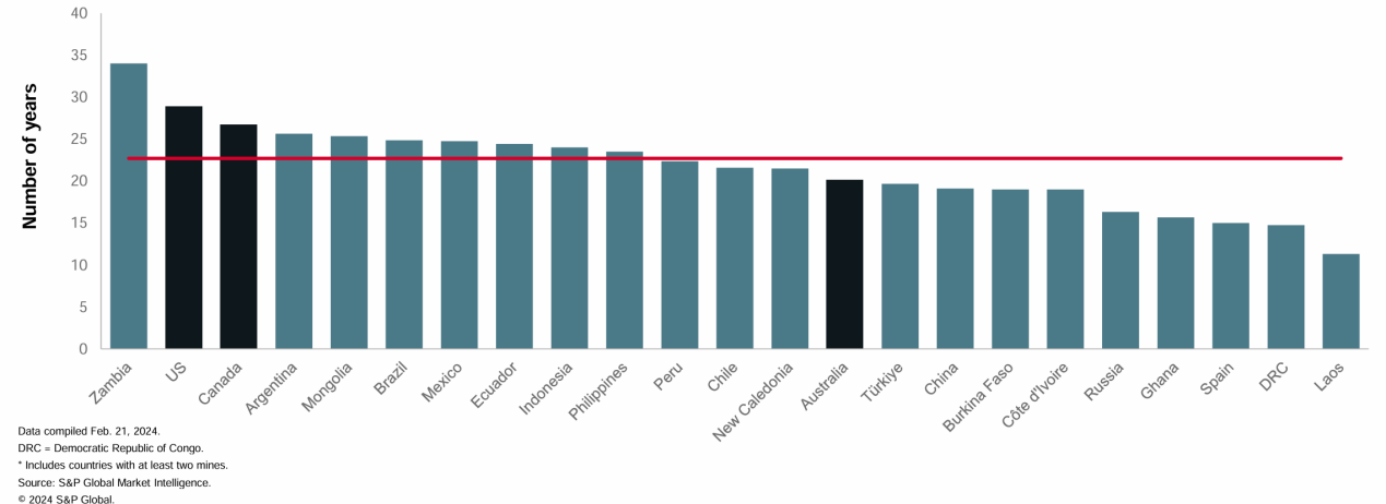 横向比较各国矿产开发的平均周期,美国“屈居”赞比亚。 数据来源:标普全球市场情报公司。